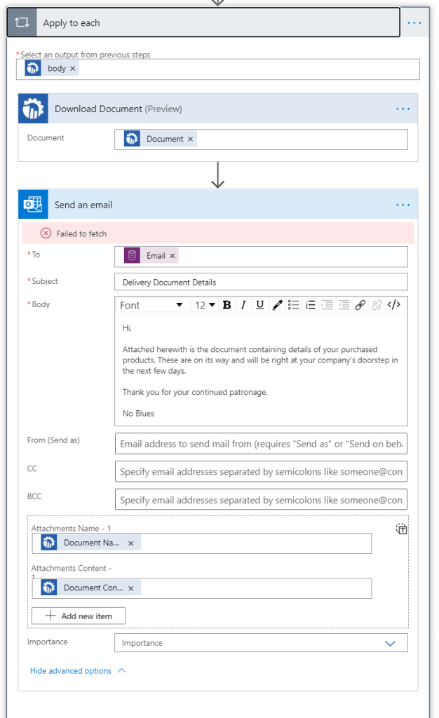 I’ve seen blogs where Power Automate does all the heavy lifting. It takes care of retrieving all the relevant data and putting it in the right spots within the document. That’s well and good. What I’ve done here is actually to leverage XpertDoc in taking care of the document template and generation aspects (which is what the product is all about) while Power Automate is responsible for sending out the emails, checking conditions, looping through records, etc.