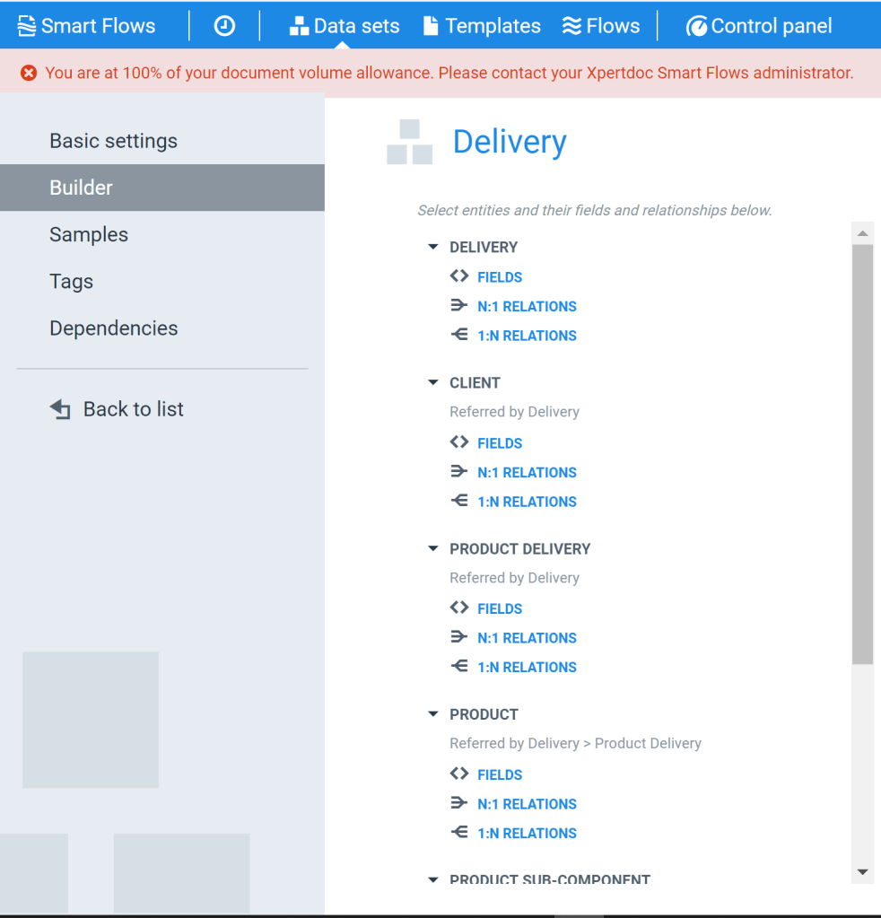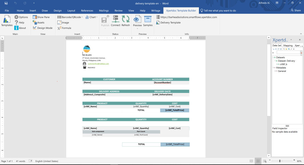 The first question might be: Can’t we use the word template in Dynamics 365 to print the document? Surely we can, but only up to the extent that the entities we will be pulling data from are limited to the ones that are one level above and one level below our triggering entity. In the diagram above, if Delivery is the triggering entity, then we can only get data from the Client and the Product Delivery entities. If I want to get further down to the Product Delivery Product Sub-component, that is the end of the journey of the out-of-the-box document generation of Dynamics 365. The image below is inserted to stress that restriction.