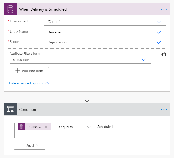 The Power Automate flow runs when the statuscode of the Delivery entity record changes. It will proceed to the next set of steps only if the statuscode value is Scheduled.