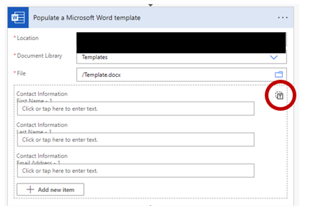 2.5 The Populate a Microsoft Word template provides the capability to enter the retrieved data onto the word template. The controls on the template were automatically detected when adding this action. However, I want to switch the input box into an array by clicking the tiny icon on the top-right corner. Doing so will compress the input into a single box. This is where the output from Step 2.4 will go.