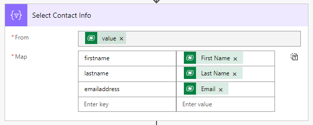 2.4 The Select data operation allows shaping the content of the objects within the array (Reference: https://docs.microsoft.com/en-us/power-automate/data-operations). In this case, I only want to pull data from three fields, namely: first name, last name, and email address. The data for these three are to be taken from the List records action. It’s also important to note that field names on the mapping table below should match the tag of the corresponding control added into the template.