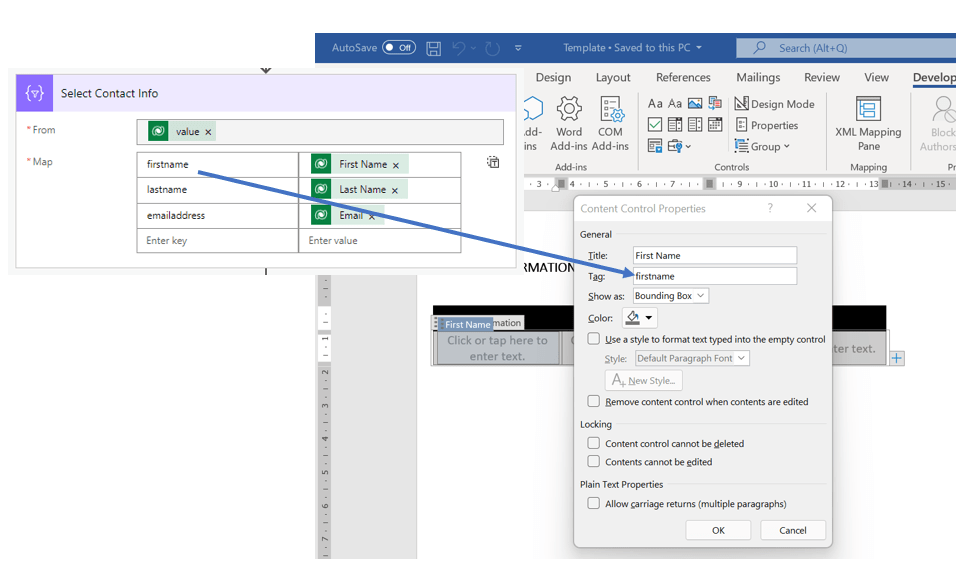 Plain text controls, which will hold the data pulled from Dataverse, must be inserted into the template. If the data is repeating, such as when trying to get data from a related table (meaning the N side of a 1:N relationship), a repeating content control must be added. Once this template is built, store the document into your Document Library of choice in Sharepoint.
